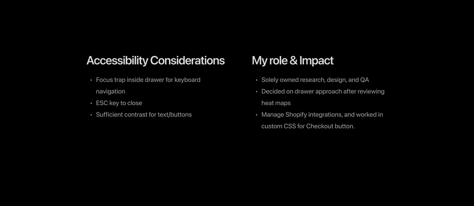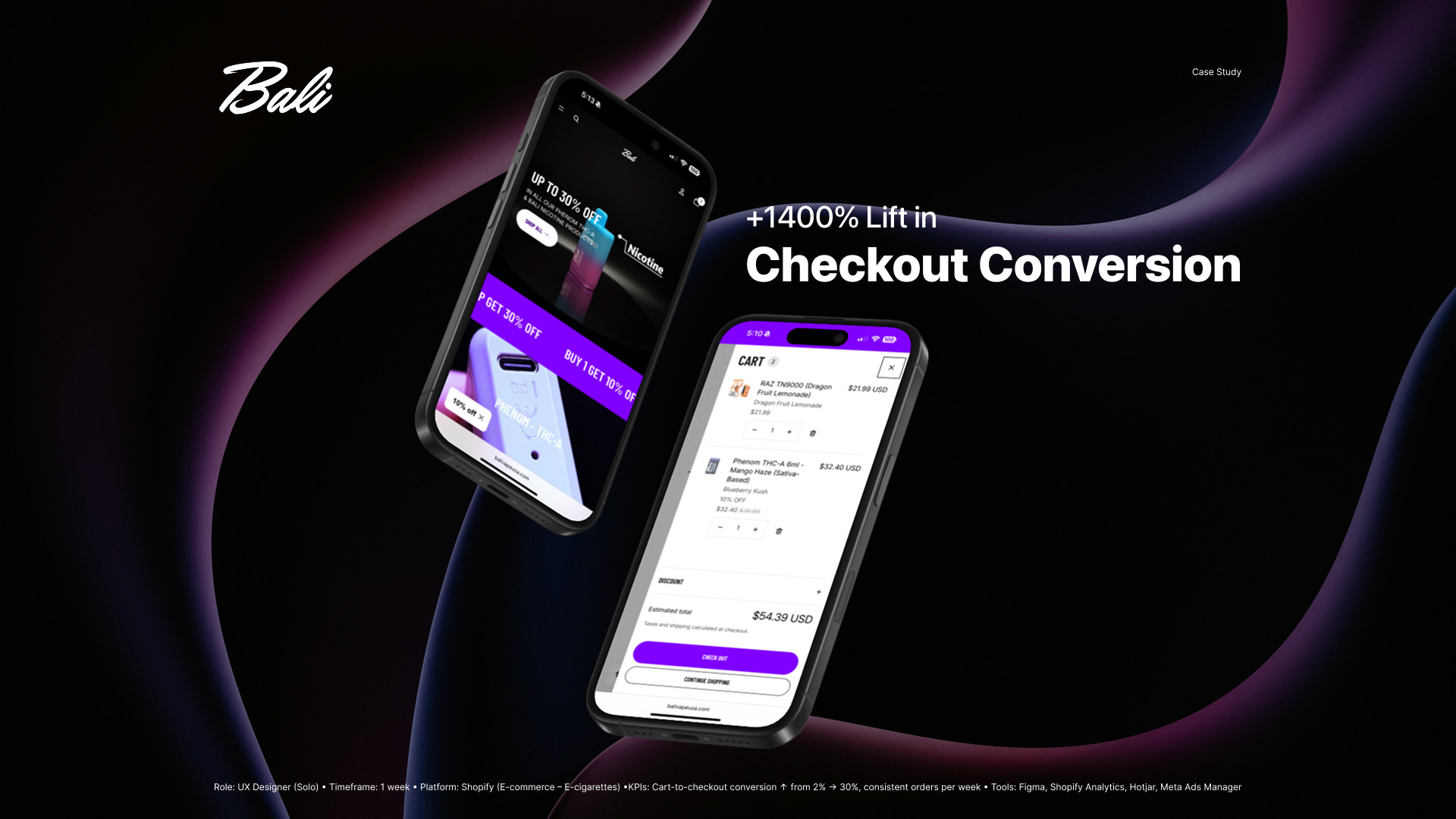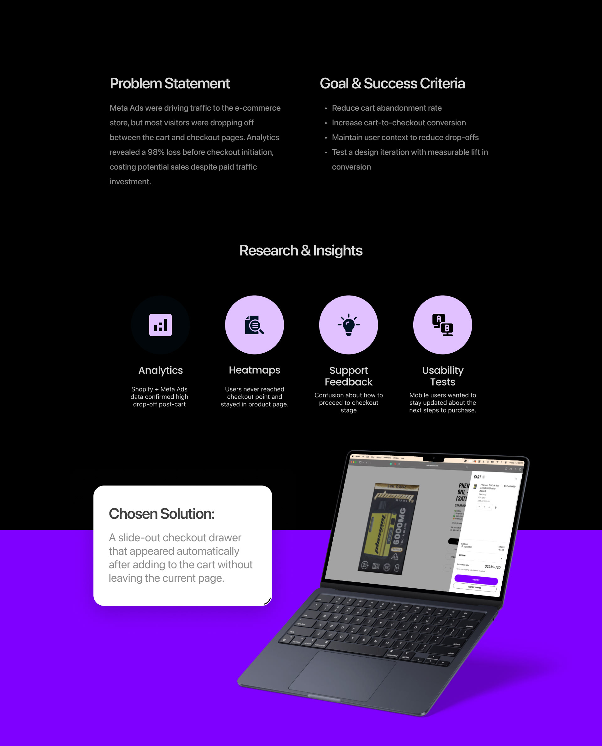 This UX case study showcases how I redesigned the checkout experience for an e-commerce store on Shopify, boosting cart-to-checkout conversion from 2% to 30% in just one week. Through data analysis, heatmaps, and quick usability testing, I identified that users were abandoning the cart before checkout due to loss of context and uncertainty about how to proceed. The solution was a smart checkout drawer that allowed customers to review order summary, and easily continue with checkout flow without leaving the cart page. This reduced friction, increased trust, and streamlined the user flow—especially on mobile, where 80% of traffic came from. The result was a +1400% lift in conversion rate, moving from almost no weekly orders to consistent sales, even after campaigns ended. This project demonstrates how a simple, user-centered design change can have a significant business impact in e-commerce.